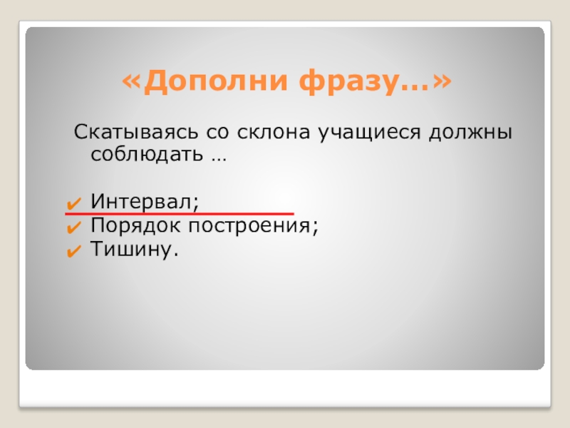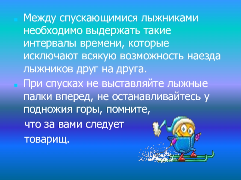 Слайд 47Между спускающимися лыжниками необходимо выдержать такие интервалы времени, которые исключают всякую