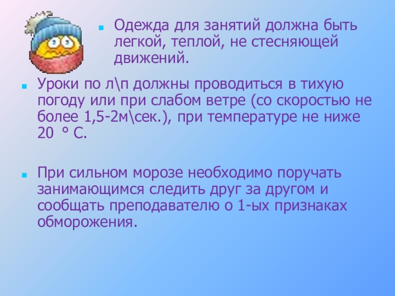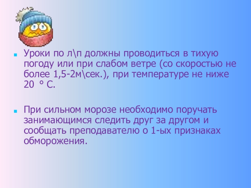 Слайд 73Уроки по л\п должны проводиться в тихую погоду или при слабом