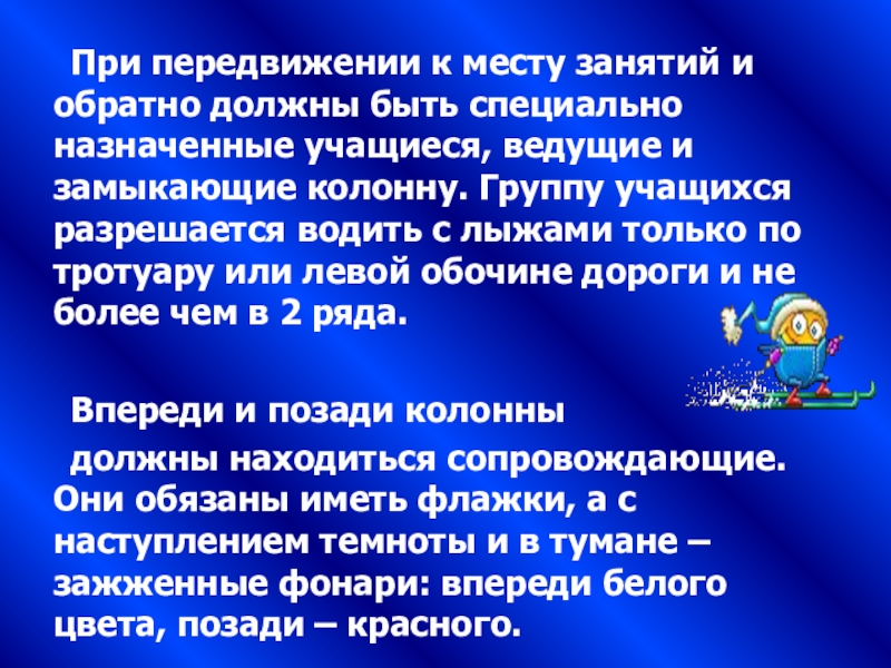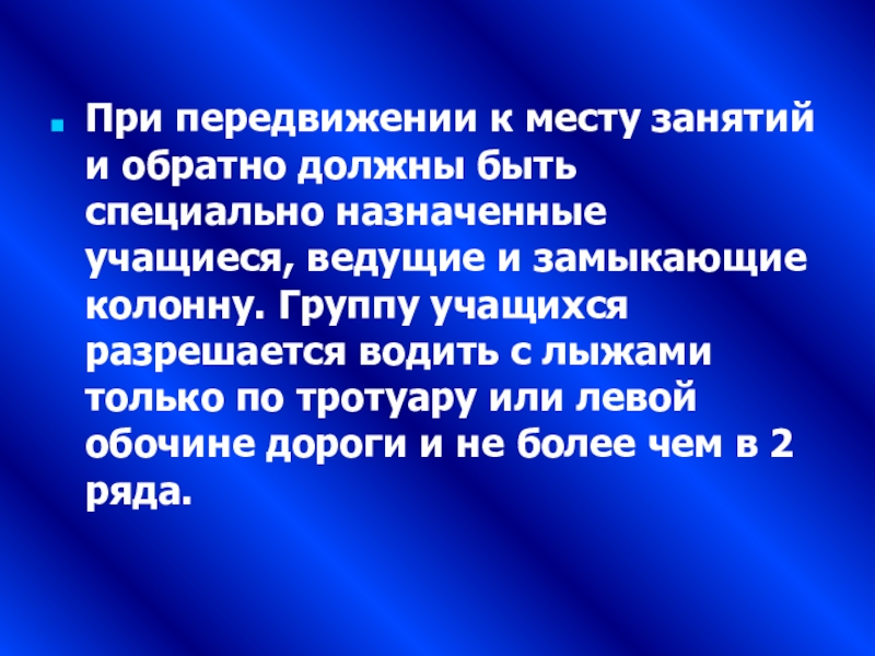 учащиеся, ведущие и замыкающие колонну. Группу учащихся разрешается водить с лыжами только по тротуару или левой обочине дороги и не более чем в 2 ряда.