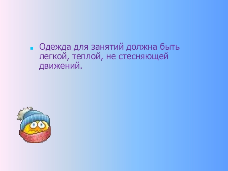 Слайд 72Одежда для занятий должна быть легкой, теплой, не стесняющей движений.