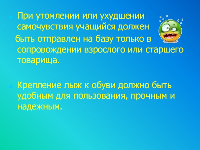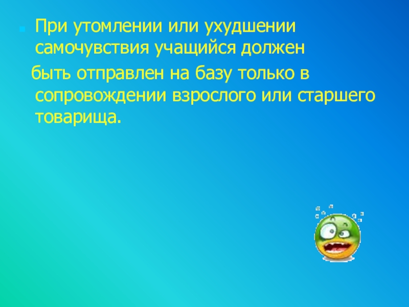 Слайд 74При утомлении или ухудшении самочувствия учащийся должен