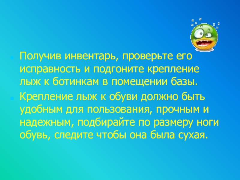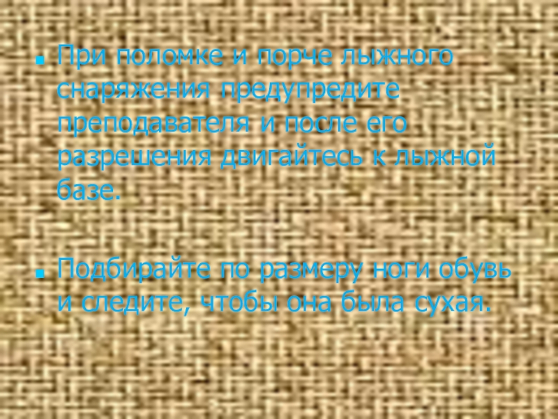 Слайд 48При поломке и порче лыжного снаряжения предупредите преподавателя и после его