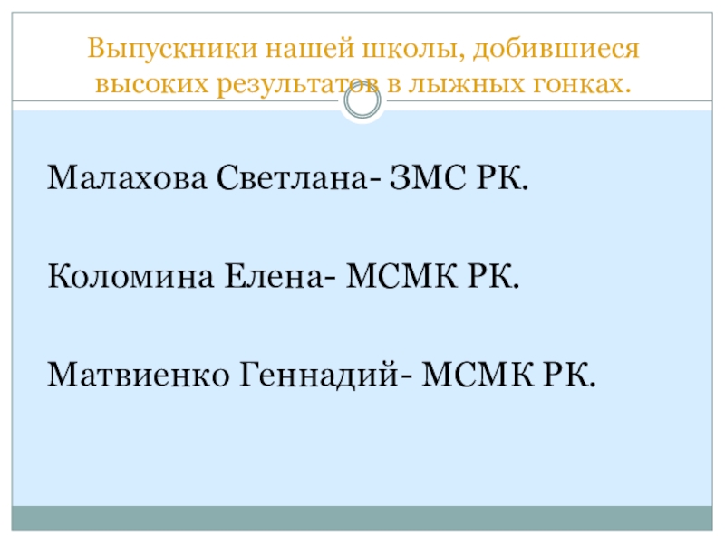Слайд 33Выпускники нашей школы, добившиеся высоких результатов в лыжных гонках.