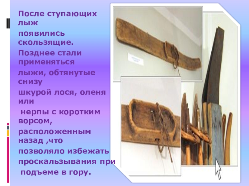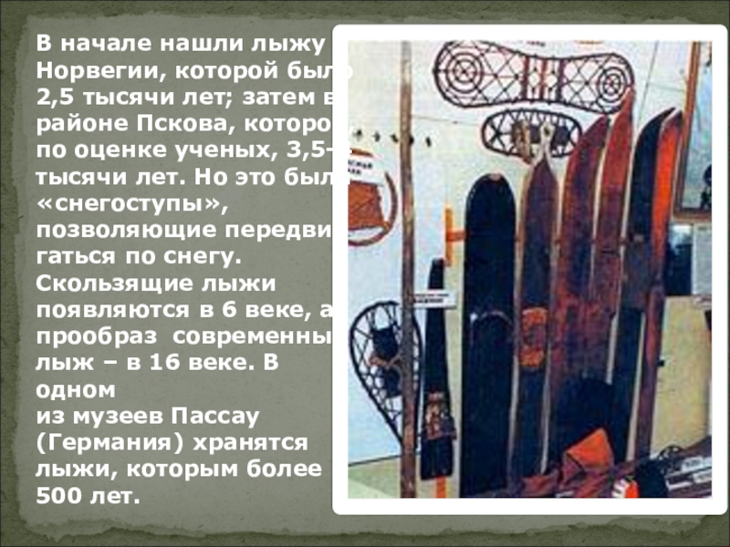 затем в районе Пскова, которой, по оценке ученых, 3,5-4 тысячи лет. Но это были «снегоступы», позволяющие передви-гаться по снегу. Скользящие лыжи появляются в 6 веке, а прообраз современных лыж – в 16 веке. В одном