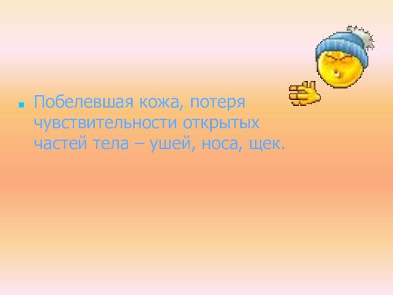 Слайд 78Побелевшая кожа, потеря чувствительности открытых частей тела – ушей, носа, щек.