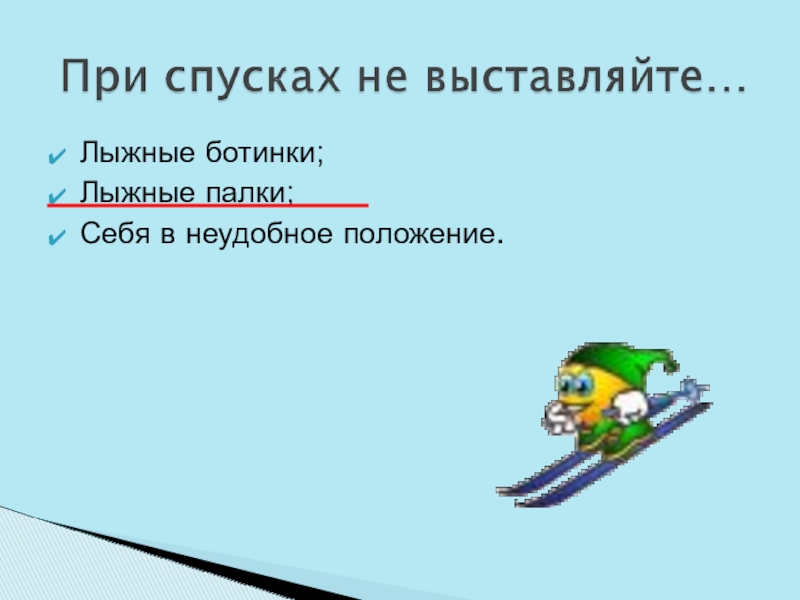 При спусках не выставляйте лыжные палки вперед, не останавливайтесь у подножия горы, помните,