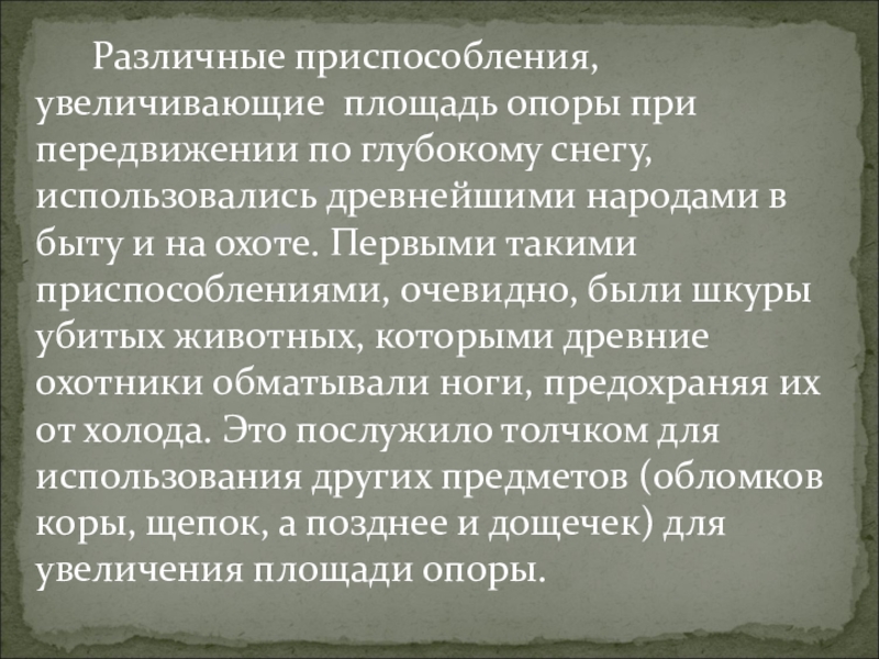 снегу, использовались древнейшими народами в быту и на охоте. Первыми такими приспособлениями, очевидно, были шкуры убитых животных, которыми древние охотники обматывали ноги, предохраняя их от холода. Это послужило толчком для использования других предметов (обломков коры, щепок, а позднее и дощечек) для увеличения площади опоры.