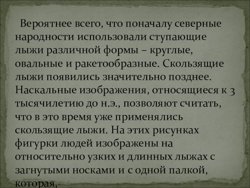 Слайд 14Вероятнее всего, что поначалу северные народности использовали ступающие лыжи различной формы