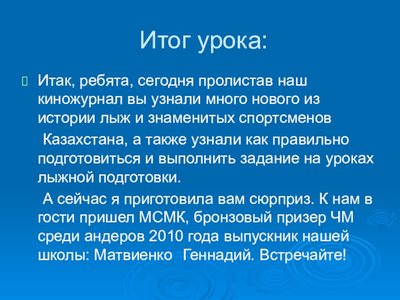 А сейчас я приготовила вам сюрприз. К нам в гости пришел МСМК, бронзовый призер ЧМ среди андеров 2010 года выпускник нашей школы: Матвиенко Геннадий. Встречайте!
