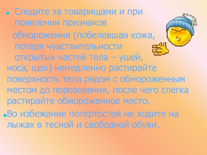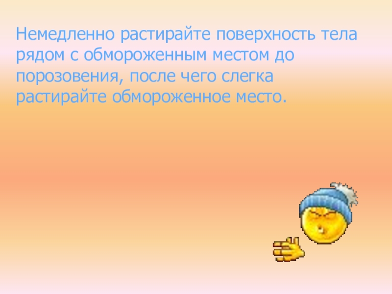 Слайд 79Немедленно растирайте поверхность тела рядом с обмороженным местом до порозовения, после