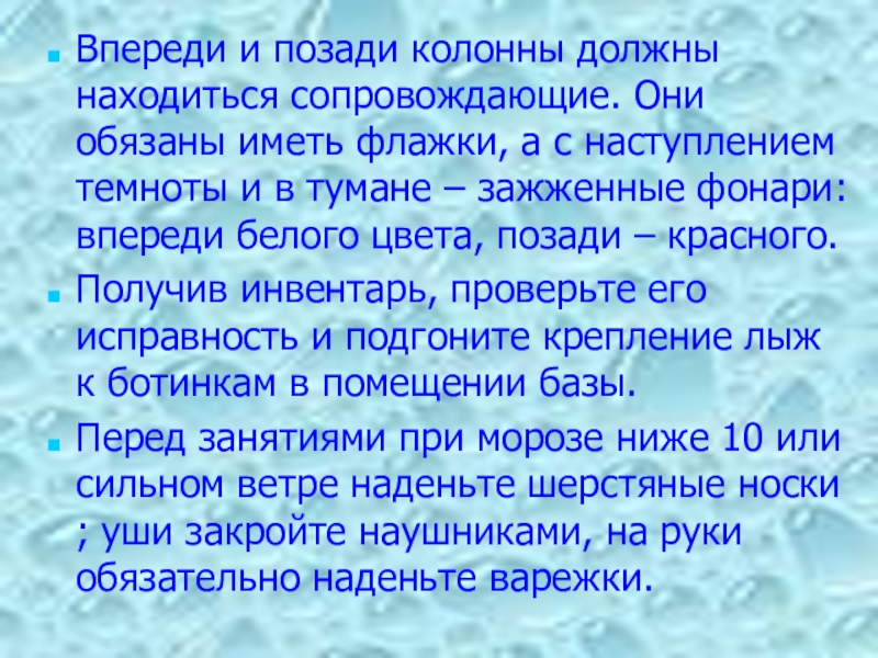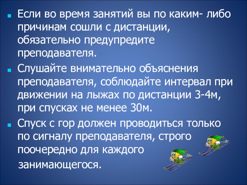 Слушайте внимательно объяснения преподавателя, соблюдайте интервал при движении на лыжах по дистанции 3-4м, при спусках не менее 30м.