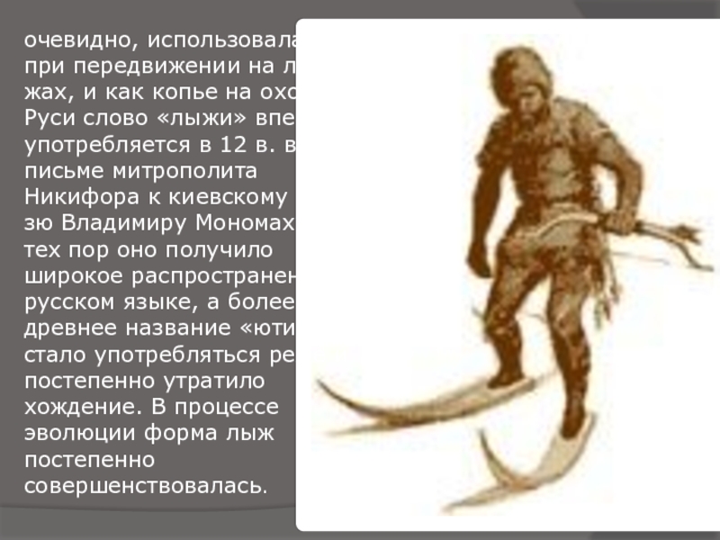охоте. На Руси слово «лыжи» впервые употребляется в 12 в. в письме митрополита Никифора к киевскому кня-зю Владимиру Мономаху. С тех пор оно получило широкое распространение в русском языке, а более древнее название «юти» стало употребляться реже и постепенно утратило хождение. В процессе эволюции форма лыж постепенно совершенствовалась.