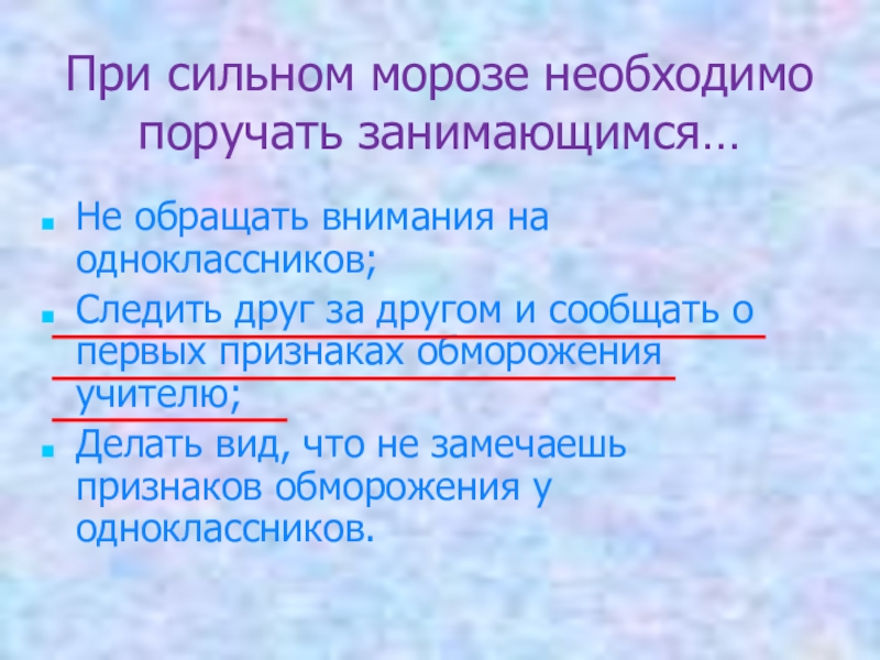 Делать вид, что не замечаешь признаков обморожения у одноклассников.