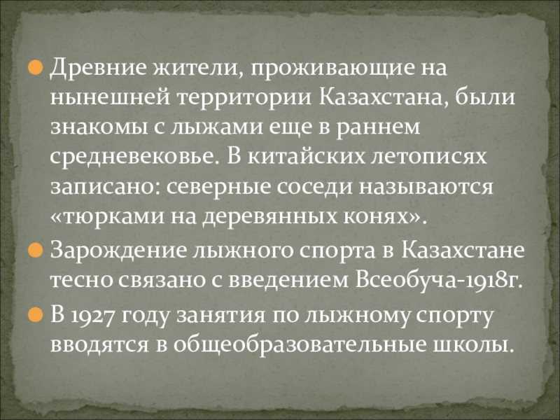 Слайд 19Древние жители, проживающие на нынешней территории Казахстана, были знакомы с лыжами