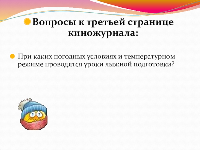Слайд 50При каких погодных условиях и температурном режиме проводятся уроки лыжной подготовки?