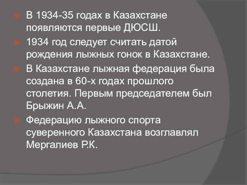 В Казахстане лыжная федерация была создана в 60-х годах прошлого столетия. Первым председателем был Брыжин А.А.
