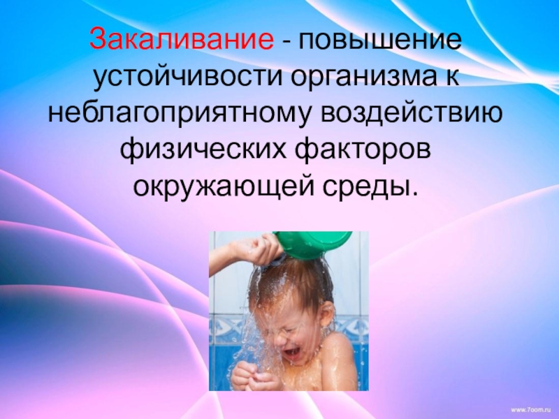 Слайд 3Закаливание - повышение устойчивости организма к неблагоприятному воздействию физических факторов окружающей