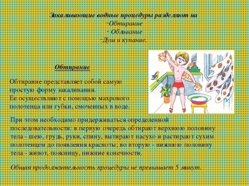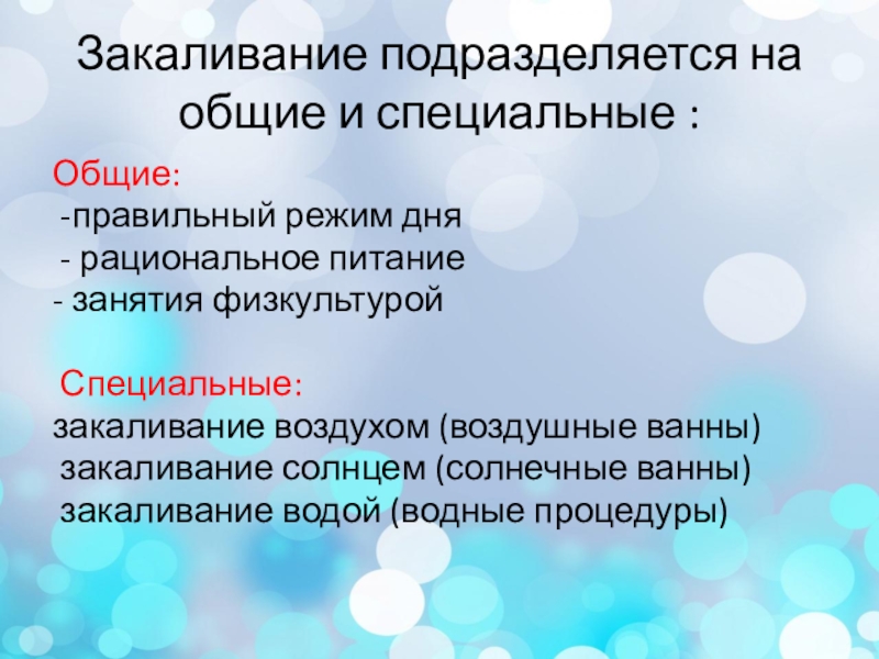 Закаливание подразделяется на общие и специальные :Общие: -правильный режим дня - рациональное питание - занятия физкультурой Специальные: