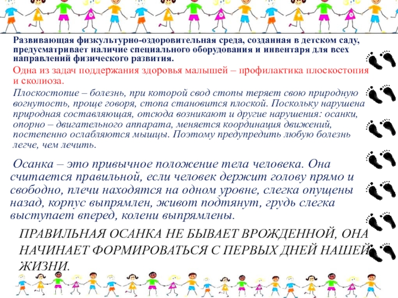 Одна из задач поддержания здоровья малышей – профилактика плоскостопия и сколиоза.