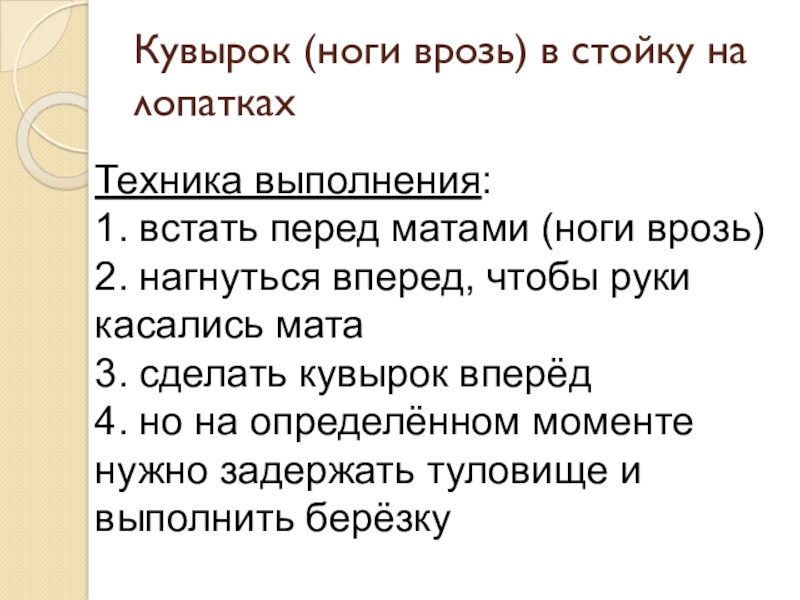 Кувырок (ноги врозь) в стойку на лопаткахТехника выполнения:1. встать перед матами (ноги врозь)2. нагнуться вперед, чтобы руки