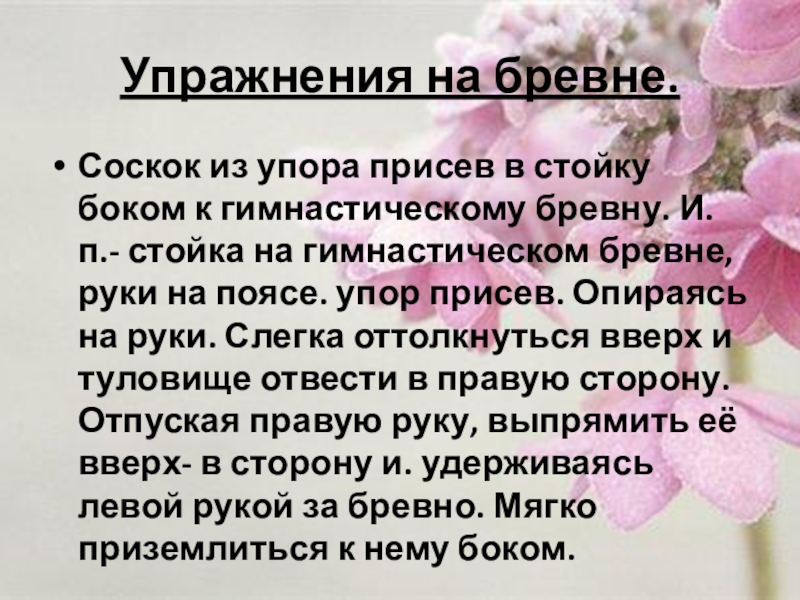 Слайд 3Упражнения на бревне.