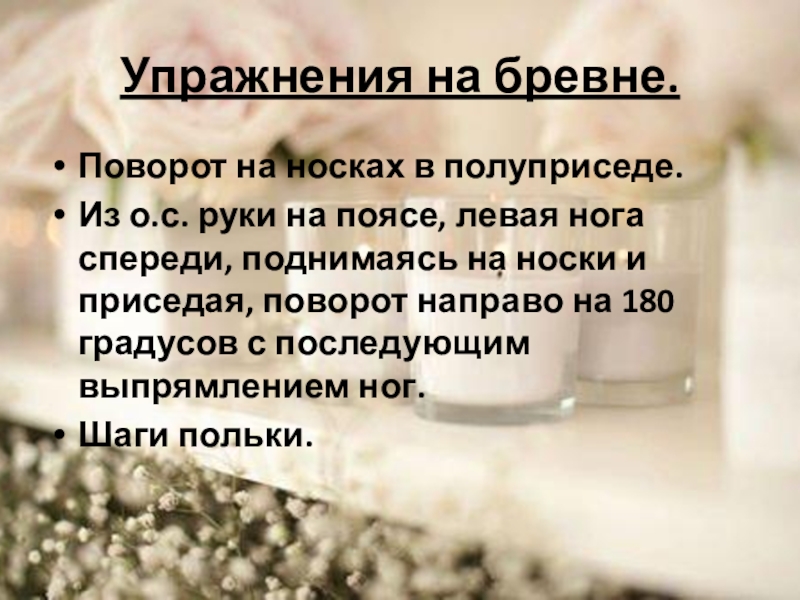 Упражнения на бревне.Поворот на носках в полуприседе. Из о.с. руки на поясе, левая нога спереди, поднимаясь на носки и приседая, поворот направо на 180 градусов с последующим выпрямлением ног. Шаги польки.
