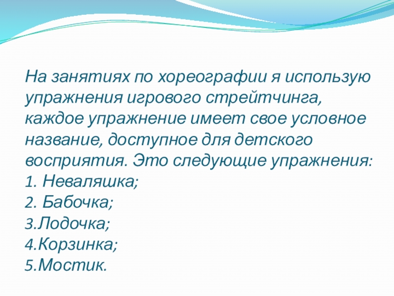 Слайд 10На занятиях по хореографии я использую упражнения игрового стрейтчинга, каждое упражнение
