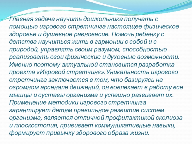 Именно поэтому актуальной становится разработка проекта «Игровой стретчинг».Уникальность игрового стретчинга заключается в том, что базируясь на огромном арсенале движений, он вовлекает в работу все мышцы и суставы организма и успешно развивает их. Применение методики игрового стретчинга гарантирует детям правильное развитие систем организма, является отличной профилактикой сколиоза и плоскостопия, прививает коммуникативные навыки, формирует привычку здорового образа жизни.