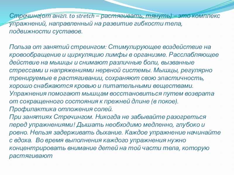 При занятиях Стречингом. Никогда не забывайте разогреться перед упражнениями! Дышать необходимо медленно, глубоко и ровно. Нельзя задерживать дыхание. Каждое упражнение начинайте с вдоха. Во время выполнения каждого упражнения нужно концентрировать внимание детей на той части тела, которую растягивают
