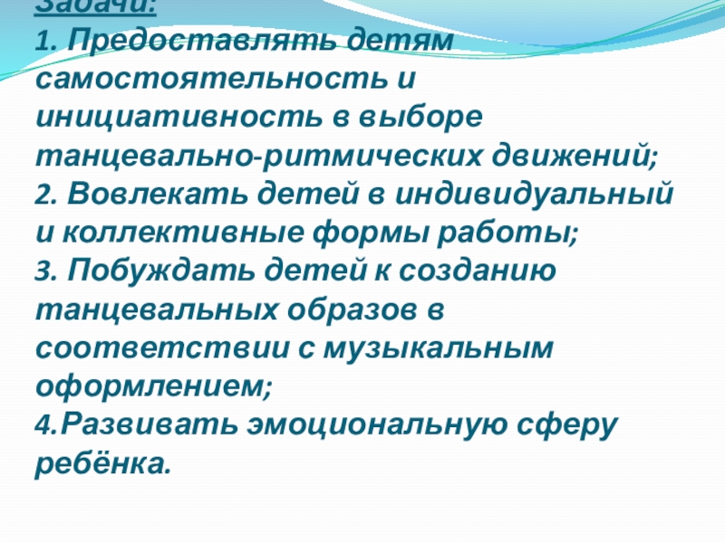 1. Предоставлять детям самостоятельность и инициативность в выборе танцевально-ритмических движений;