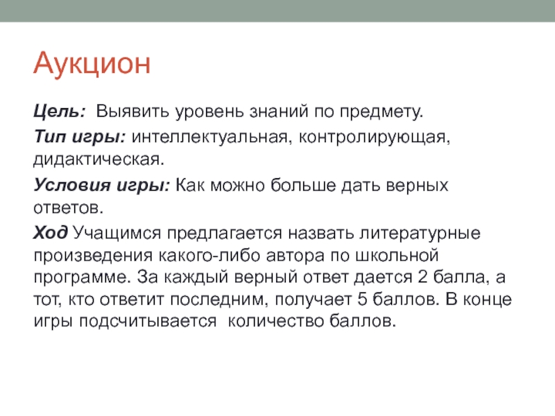 Ход Учащимся предлагается назвать литературные произведения какого-либо автора по школьной программе. За каждый верный ответ дается 2 балла, а тот, кто ответит последним, получает 5 баллов. В конце игры подсчитывается количество баллов.
