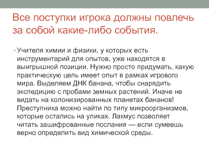 физики, у которых есть инструментарий для опытов, уже находятся в выигрышной позиции. Нужно просто придумать, какую практическую цель имеет опыт в рамках игрового мира. Выделяем ДНК банана, чтобы снарядить экспедицию с пробами земных растений. Иначе не видать на колонизированных планетах бананов! Преступника можно найти по типу микроорганизмов, которые остались на уликах. Лакмус позволяет читать зашифрованные послания — если сумеешь верно определить вид химической среды.