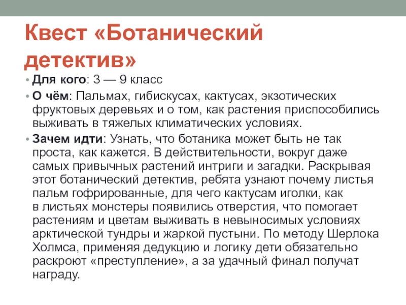 Зачем идти: Узнать, что ботаника может быть не так проста, как кажется. В действительности, вокруг даже самых привычных растений интриги и загадки. Раскрывая этот ботанический детектив, ребята узнают почему листья пальм гофрированные, для чего кактусам иголки, как в листьях монстеры появились отверстия, что помогает растениям и цветам выживать в невыносимых условиях арктической тундры и жаркой пустыни. По методу Шерлока Холмса, применяя дедукцию и логику дети обязательно раскроют «преступление», а за удачный финал получат награду.
