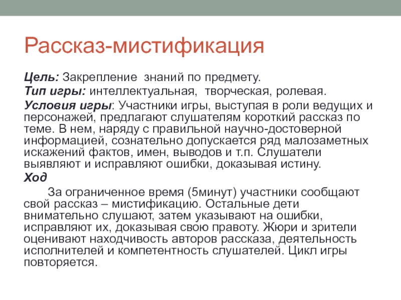 За ограниченное время (5минут) участники сообщают свой рассказ – мистификацию. Остальные дети внимательно слушают, затем указывают на ошибки, исправляют их, доказывая свою правоту. Жюри и зрители оценивают находчивость авторов рассказа, деятельность исполнителей и компетентность слушателей. Цикл игры повторяется.