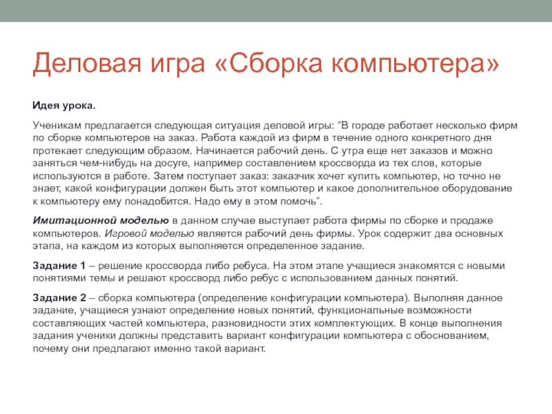 Имитационной моделью в данном случае выступает работа фирмы по сборке и продаже компьютеров. Игровой моделью является рабочий день фирмы. Урок содержит два основных этапа, на каждом из которых выполняется определенное задание.