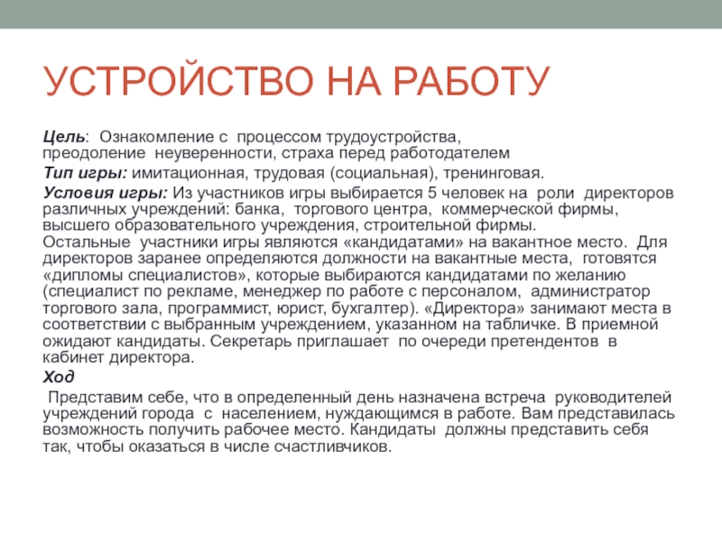 Цель: Ознакомление с процессом трудоустройства, преодоление неуверенности, страха перед