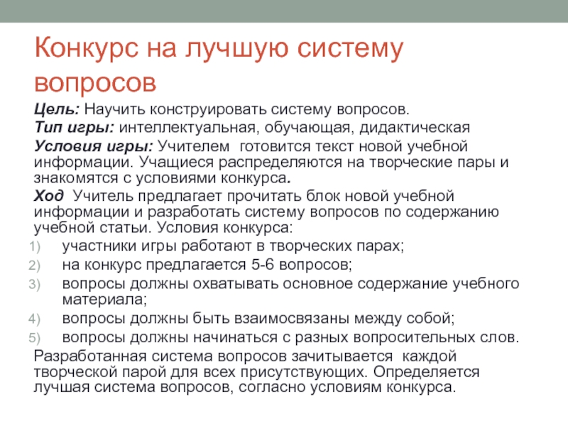 Разработанная система вопросов зачитывается каждой творческой парой для всех присутствующих. Определяется лучшая система вопросов, согласно условиям конкурса.