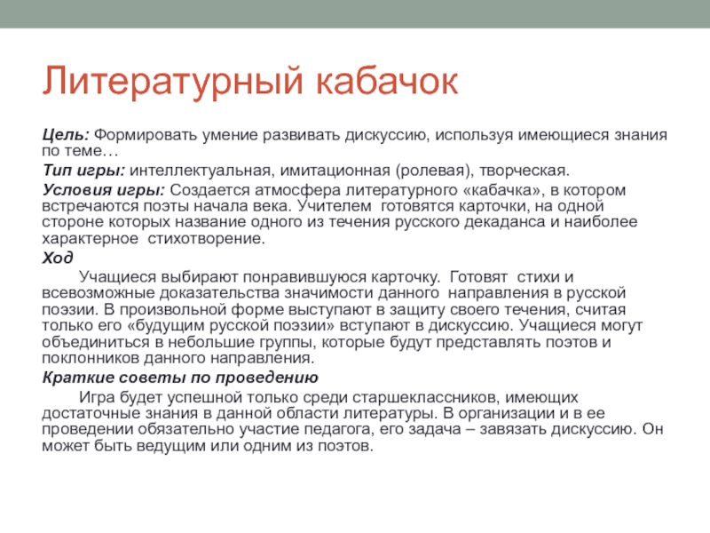 Условия игры: Создается атмосфера литературного «кабачка», в котором встречаются поэты начала века. Учителем готовятся карточки, на одной стороне которых название одного из течения русского декаданса и наиболее характерное стихотворение.