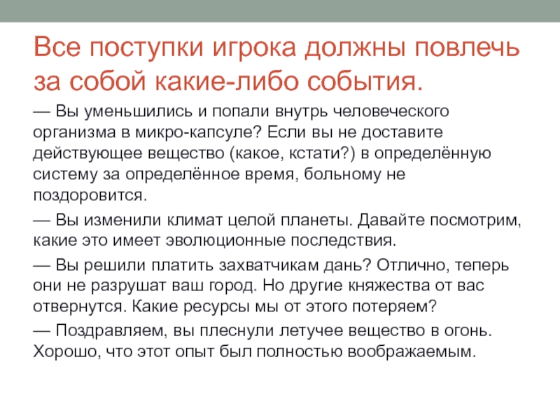 Слайд 9Все поступки игрока должны повлечь за собой какие-либо события.