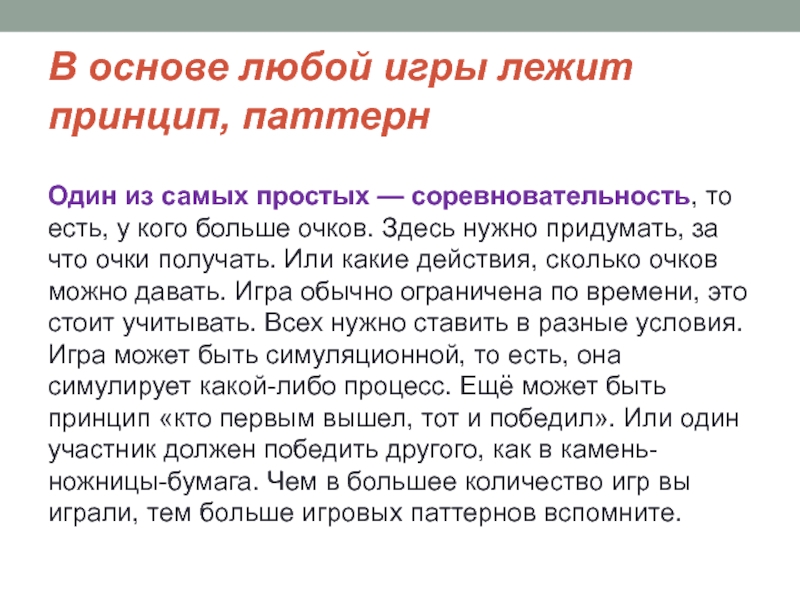 соревновательность, то есть, у кого больше очков. Здесь нужно придумать, за что очки получать. Или какие действия, сколько очков можно давать. Игра обычно ограничена по времени, это стоит учитывать. Всех нужно ставить в разные условия. Игра может быть симуляционной, то есть, она симулирует какой-либо процесс. Ещё может быть принцип «кто первым вышел, тот и победил». Или один участник должен победить другого, как в камень-ножницы-бумага. Чем в большее количество игр вы играли, тем больше игровых паттернов вспомните.