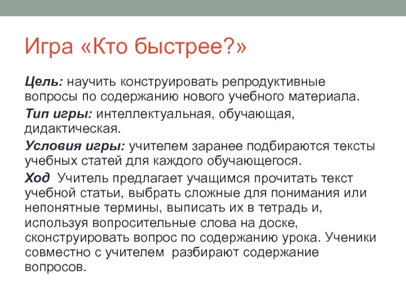 Тип игры: интеллектуальная, контролирующая, дидактическая.