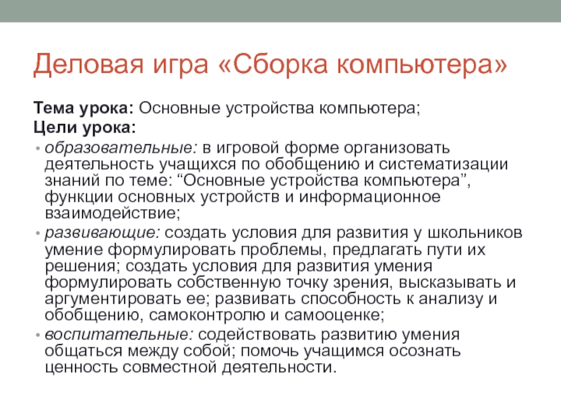 деятельность учащихся по обобщению и систематизации знаний по теме: “Основные устройства компьютера”, функции основных устройств и информационное взаимодействие;
