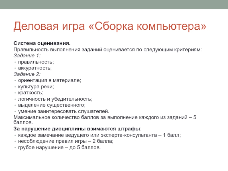 правилами игры, системой оценивания, карточки с кроссвордами и ребусами, карточки с изображениями комплектующих и периферийных устройств, учебник, прайс-лист, памятку по ведению беседы с заказчиком.