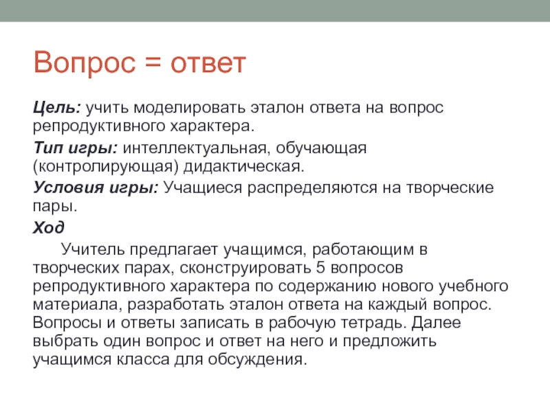Цель: учить моделировать эталон ответа на вопрос репродуктивного характера.