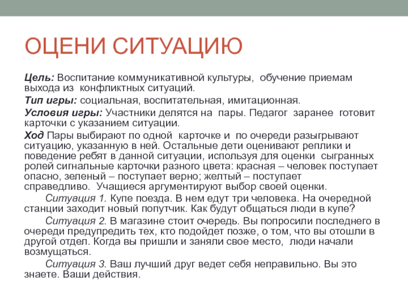 Условия игры: Участники делятся на пары. Педагог заранее готовит карточки с указанием ситуации.