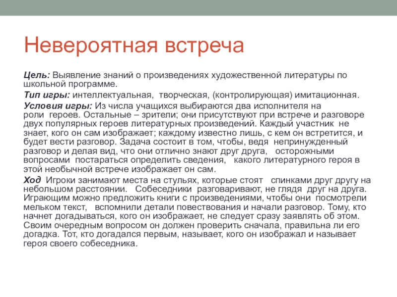 Условия игры: Из числа учащихся выбираются два исполнителя на роли героев. Остальные – зрители; они присутствуют при встрече и разговоре двух популярных героев литературных произведений. Каждый участник не знает, кого он сам изображает; каждому известно лишь, с кем он встретится, и будет вести разговор. Задача состоит в том, чтобы, ведя непринужденный разговор и делая вид, что они отлично знают друг друга, осторожными вопросами постараться определить сведения, какого литературного героя в этой необычной встрече изображает он сам.