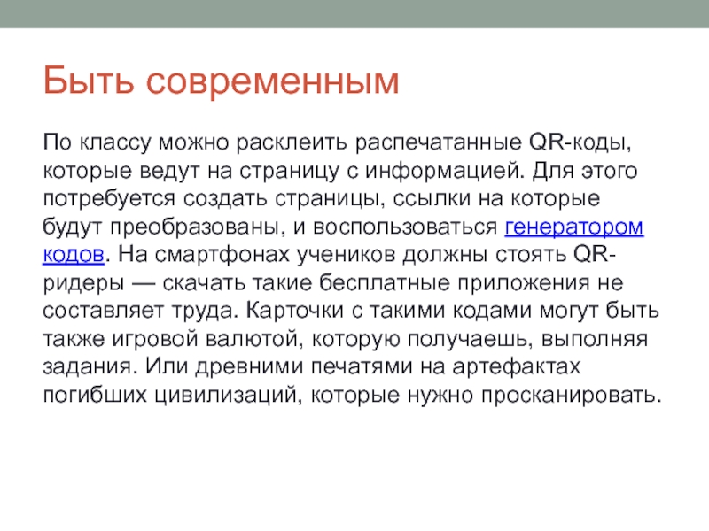информацией. Для этого потребуется создать страницы, ссылки на которые будут преобразованы, и воспользоваться генератором кодов. На смартфонах учеников должны стоять QR-ридеры — скачать такие бесплатные приложения не составляет труда. Карточки с такими кодами могут быть также игровой валютой, которую получаешь, выполняя задания. Или древними печатями на артефактах погибших цивилизаций, которые нужно просканировать.