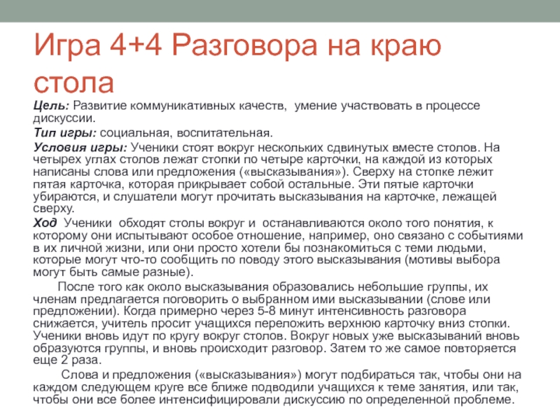 Ход Игроки занимают места на стульях, которые стоят спинками друг другу на небольшом расстоянии. Собеседники разговаривают, не глядя друг на друга. Играющим можно предложить книги с произведениями, чтобы они посмотрели мельком текст, вспомнили детали повествования и начали разговор. Тому, кто начнет догадываться, кого он изображает, не следует сразу заявлять об этом. Своим очередным вопросом он должен проверить сначала, правильна ли его догадка. Тот, кто догадался первым, называет, кого он изображал и называет героя своего собеседника.