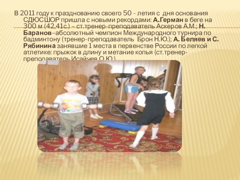 основания СДЮСШОР пришла с новыми рекордами: А.Герман в беге на 300 м (42,41с.) – ст.тренер-преподаватель Аскеров А.М.; Н. Баранов–абсолютный чемпион Международного турнира по бадминтону (тренер-преподаватель Брон Н.Ю.); А. Беляев и С.Рябинина занявшие 1 места в первенстве России по легкой атлетике: прыжок в длину и метание копья (ст.тренер-преподаватель Исайчев О.Ю.)