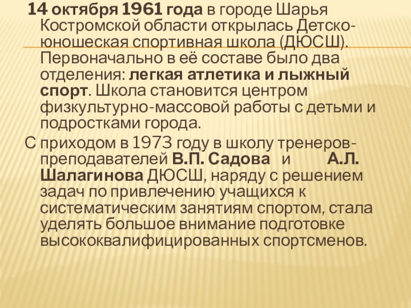 С приходом в 1973 году в школу тренеров-преподавателей В.П. Садова и А.Л. Шалагинова ДЮСШ, наряду с решением задач по привлечению учащихся к систематическим занятиям спортом, стала уделять большое внимание подготовке высококвалифицированных спортсменов.